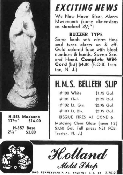 Frank Hollendonner came to the USA from Austria in the early 1940s and subsequently worked for Boleslaw and Marja Cybis as a moldmaker at their studio. In 1946 Mr. Hollendonner opened his own business, the Holland Mold company on Pennsylvania Avenue in Trenton, selling molds to manufacturers and hobbyists. The company published regular catalogs and because of the high quality of their molds they became very well regarded in the industry; the company operated until 1997.