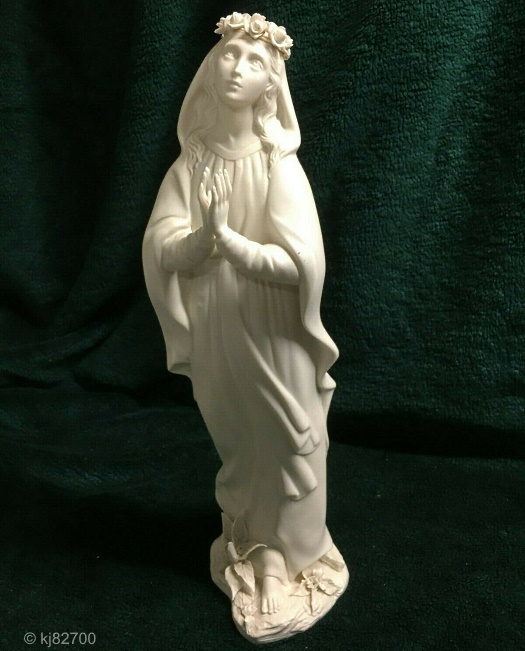 This is the Holland Mold for this piece, in a 1959 trade magazine ad. The only difference is that Cybis added a crown of roses and handmade flowers and leaves at her feet. The studio also produced a separate version from this same mold, onto which they added a rosary, a halo, and a flowering branch next to her leg; they gave a separate Cybis design number and name: Our Lady of Lourdes ‘Healer of the Sick.‘