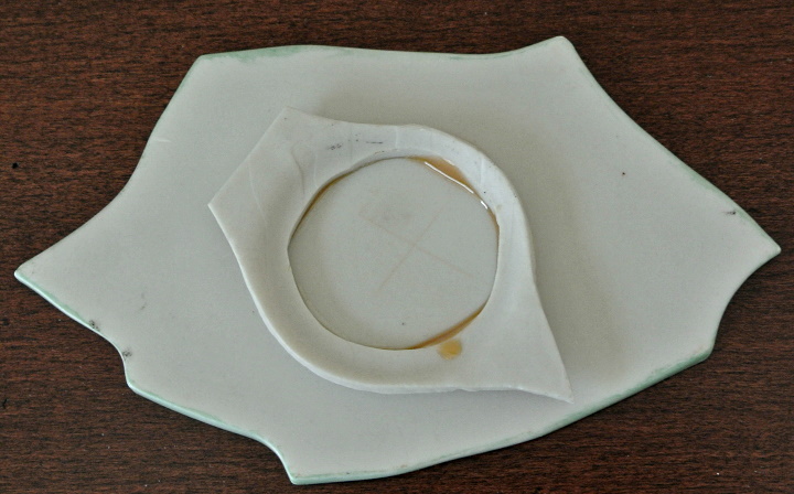 Having only ever seen fully-assembled Limnettes for sale, I had assumed that the flat back of the porcelain was simply glued onto the front of the wood (or porcelain) wedge that supported it. But, thanks to the gift of an unmounted example from a Cybis artist, we can now see how the wood-mounting was actually done.