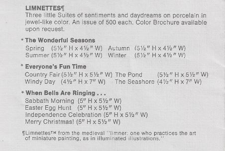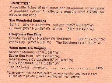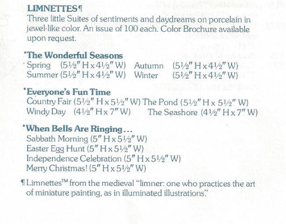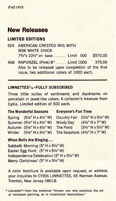 According to the brochure and also this snip of the Fall 1972 price list, each series of 12 designs was an edition of 500. This appears to mean that they will produce 500 of the Spring Limnettes, 500 of Easter Egg Hunt, 500 of Country Fair, and so on, for a total of 6000 individual, numbered Limnettes. Wow, that’s a whole lotta Limnettes!! And notice that this price list says that the editions are already “Fully subscribed” which supposedly meant that retailers had already sent in orders for a total of 1500 sets of four. In Cybis parlance, all three editions were now completed. Really?? in less than six months? That was quick, almost at warp speed. There are no prices shown here because theoretically all 6000 Limnettes have already been spoken for by retailers.