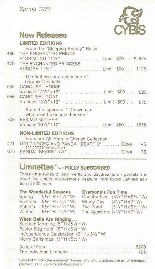 When Cybis published their 1978 catalog, which includes an Appendix, the Limnettes series are shown as Declared Issue of 500 each in 1972, and a Final Issue of 100 each in 1975 (even though the Spring and Fall 1975 price lists still said 500.) Their price is shown as $125 per each individual Limnette design.