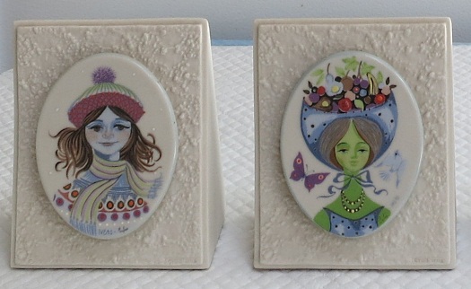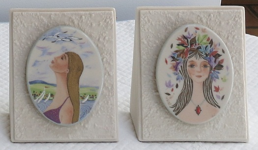 The earliest ones were produced with these bisque porcelain mounts that had a textured front surface. Here are Winter and Spring. I really wish that Cybis had not decided that Spring would have green skin because, every time I look at one, I can’t help thinking that she looks like the Wicked Witch of the West playing Chiquita Banana!