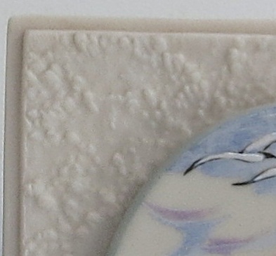 With one possible exception (the Rose Plaque), the Limnettes appear to be the only modern (meaning post-1950s) Cybis items on which the majority of the decoration is not hand-painted: Each Limnette design was applied to the porcelain piece via a full-color decal. The Ivers name is part of the decal design, although the Cybis signature and marks were applied with brown paint as usual. The small accents and highlights were applied by hand to the Limnettes but the majority of the image area is a fired-on decal.