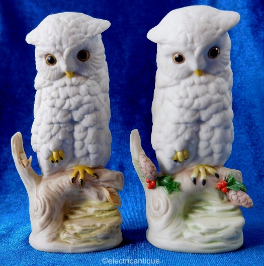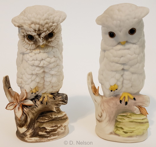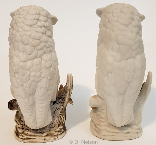 Snowy differs from the standard Baby Owl only in the decoration of the lower portion. This photo also illustrates the difference between a casting from an older mold (Snowy) compared to a newer one.