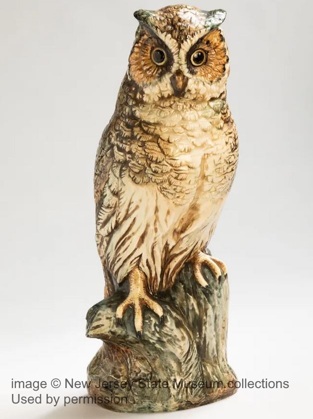 This glazed/stained glass example is the only one that I have discovered. It is part of the extensive Cybis collection at the New Jersey State Museum in Trenton, and was on display as part of their exhibit “Fine Feathered Friends: Birds as Mainstay and Muse” in 2022. The display also contained the only other Great Horned Owl produced by Cybis, as well. My sincere thanks to the Museum for permission to include their photo of their owl here. The all-over glazing indicates that this owl was physically made before 1960. This sculpture stands between 17.5” and 18” high. His final price upon retirement was $150 for the white bisque and $200 for color.