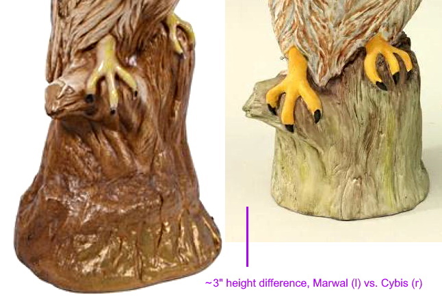 This Cybis/Marwal difference follows what happened with the Head of Girl in the same circumstances. As noted in my post about Holland Molds used by Cybis, the mold version sold to Marwal and to hobbyists in general has a wavy lock of hair above her right temple; the Cybis mold, which they purchased the rights to use, does not. The difference in the Great Horned Owl mold is the height of the stump section; Cybis cut off the bottom three inches, thus lowering the height while keeping the owl itself the same size. Although the Marwal owls are marked Marwal instead of Holland Mold, the odds are highly in favor of this being a Holland mold also.
