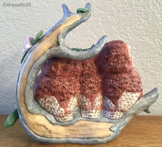 A case of awkward naming is this sculpture of an adult screech owl and owlets. Cybis named them Screech Owl and Siblings… which is a bit of tortured syntax because the small grey owls within the branch cavity are not “siblings” of the adult screech owl, they are its offspring (unless the meaning is that the owlets are siblings, but being in the same nest what else would they be??) This study is of substantial size (16.5″ high, 19.5″ wide) and was designed by Charles Oldham. A 1988 Cybis price list shows it as a limited edition of 100, priced at $3925.