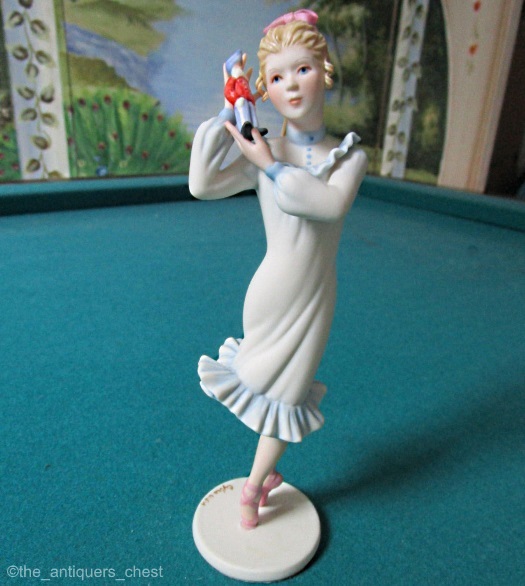 This is Clara, from The Nutcracker, an non-limited edition standing 9” high, introduced in 1985 at $395 and retired in 1987. A Cybis retailer ad during her introduction year stated that she is the “first in a series of three memorable ballerinas” which is interesting because Cybis had just finished introducing three supposedly-related ballerinas (Karina, Kristina, and Cynthia).