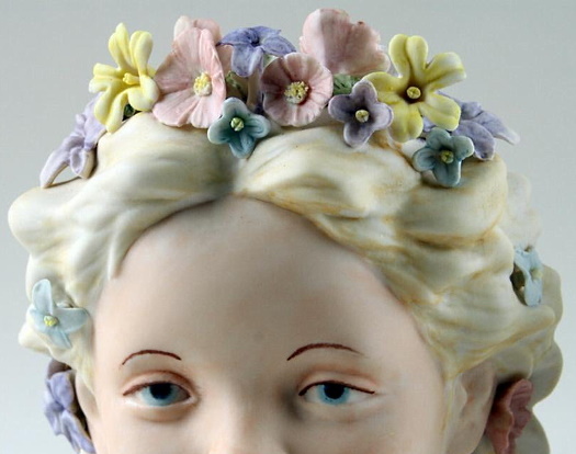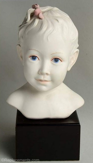 The third limited edition child bust issued by Cybis was Robin (Girl’s Head with Flowers) which is an edition of 1000 introduced in 1982. She is the largest of this genre at 10.75” high overall. Her introductory price was $475 which rose to $650 by 1988. This piece, too, was sculpted by Gertrude Fass.