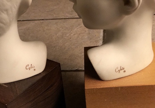 On most of these heads the Cybis signature is applied by hand with a brush, in brown paint. However, these two were signed with the same stamp that the studio used on their 1950s pieces, suggesting that these may have been among the earliest ones produced. Notice also the different wood finish used for the bases, suggesting that these were not only early but from different production ‘runs.’