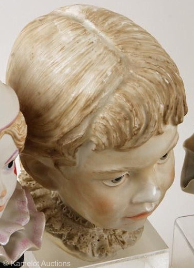 A real surprise was the discovery of this pair in an nonstandard hair color! This is the only example that I have come across and would be very interested to know whether they are one of a kind. However, they are both signed simply “Cybis” as normal, with no A.P. designation which the studio always adds to a OOAK piece. It’s also possible that they were done for a special gallery event, although those issues typically date from the 1970s and 1980s. It would be very surprising to discover one from the 1960s! This pair really flew under the collectors’ radar: it was first offered in November 2013 and did not sell; then again by the same auctioneer almost a year later in September 2014, did not sell; and finally sold – third time’s the charm – two months later at only $118 for the pair.