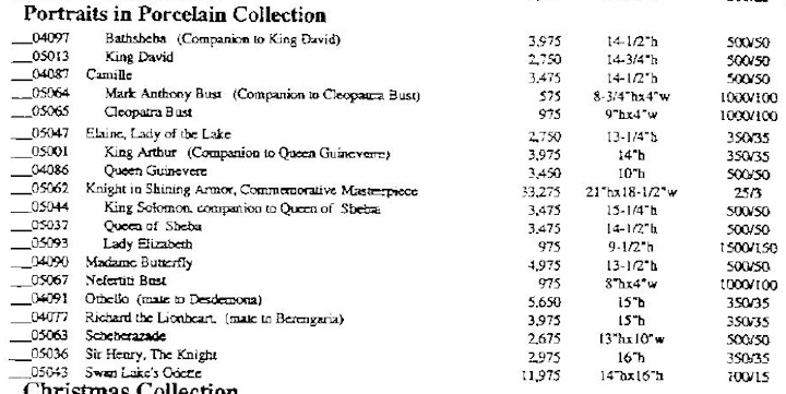 The Cybis studio’s price lists during the 1990s were horrendous; the 1989 list was the last one organized in a sensible fashion, with the sculptures listed alphabetically under each collection heading. The 1993 list does that as well, but not all of the time! Because the studio was experimenting with “Pair” and “Set” pricing on some offerings, they broke the alphabetical listing format in order to group the pair/set together. As a result, the Portraits in Porcelain section — which used to be strictly alphabetical — looks like this in 1993: