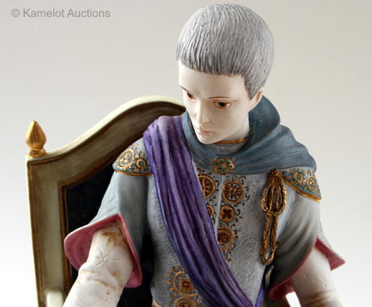The other Shakespearean portrait issued in 1965 was Hamlet, a limited edition of 500 priced at $350. The issue was completed in 1974 at $950. He is 12” high. It would be easy to assume that the coat of arms depicted on the back of Hamlet’s chair/throne is that of Denmark but alas, not so – it appears to be purely an artistic invention of the designer.