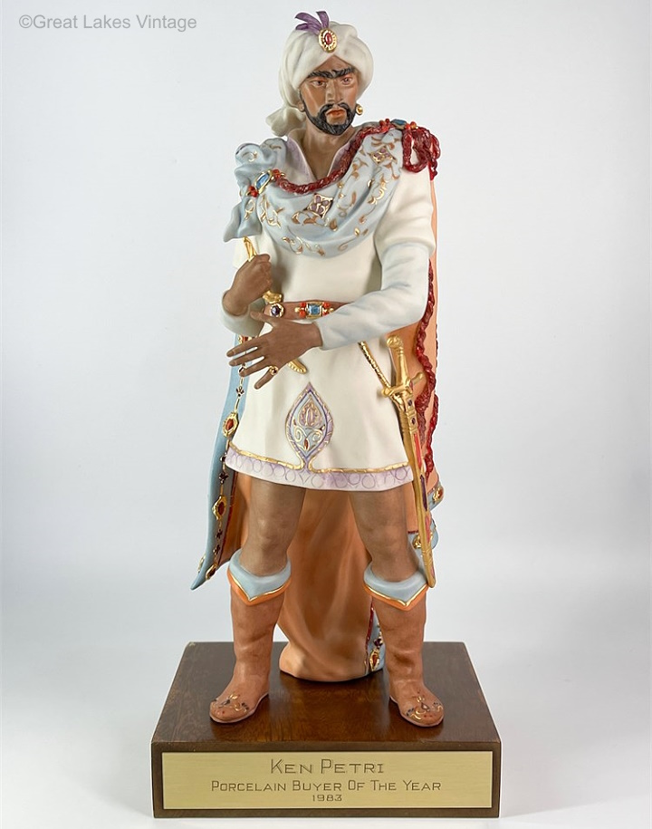 Othello is 15” tall which places him on the larger end of the scale for a Cybis portrait piece. He was priced just under $2000 at introduction in 1984 as an edition of 350; by 1988 he was $3975. Othello was designed by Gertrude Fass who was also noted for her work as a television scriptwriter, art teacher, and children’s book author as well as for her sculptures in porcelain and bronze.