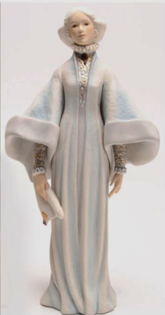 From The Merchant of Venice we have Portia, a limited edition from 1973 to 1976 and priced at $875 throughout the issue of 750. She is 13.5” tall. This sculpture was designed from a sketch made by Marylin Chorlton while she and her husband were on vacation in Nassau (Bahamas) and happened to notice a bewigged lady jurist walking down the street. The judge agreed to pose for some sketches which were then translated into Portia.