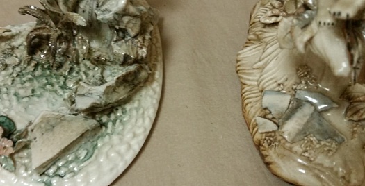 Several of the 1950s pieces incorporated rocky “chunks” of porcelain as part of the base’s design, as shown in this photo comparing the Bear Scene’s base (at right) with Bluebird ‘By the Garden Wall’ (at left) from the same time period. They also appear on some of the ca-1950s Nativity Murals.