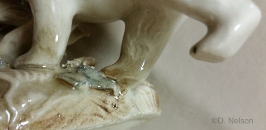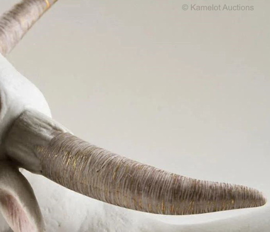 An unusual example was among the 2019 liquidation-sale lots. This bull’s horns are decorated with gold, and almost look as if they were wrapped in thin gold wire; they seem too perfectly straight to have been brushmarks. The hooves are also glazed white instead of being gray. The base is not the one that the retail piece was sold with; although the same color, it is longer.