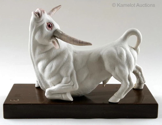 But getting back to the Cybis bullpen, their 1963 price list also includes Europa and the Bull as a limited edition of 200 selling for $350. The color was shown as white bisque only, and the height as 18″. This piece does not appear on the next price list I currently have (1967), nor is it included in the 1979 catalog Appendix (which does not include most of the earlier sculptures anyhow.) The Bull ‘God of the Thunderbolt’ is simply the bull with Europa removed. However, this was not an original Cybis design.