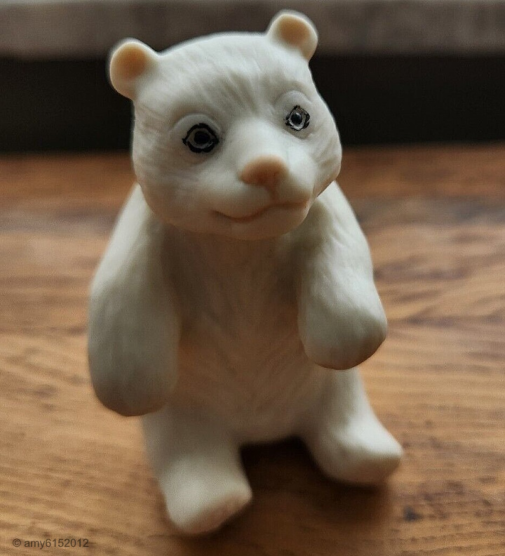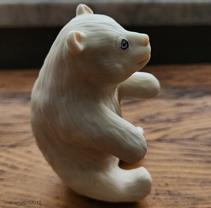 This small polar bear sitting upright appeared on eBay recently; he is 3″ high x 1.5″ wide and has the typical Cybis signature in brown paint on the underside. It is the same mold that was used for the baby panda in the 1989 piece. This was undoubtedly one of the loss-leader lower-priced items that the studio sold on-site during the 1990s to studio visitors and factory-bus tourists.