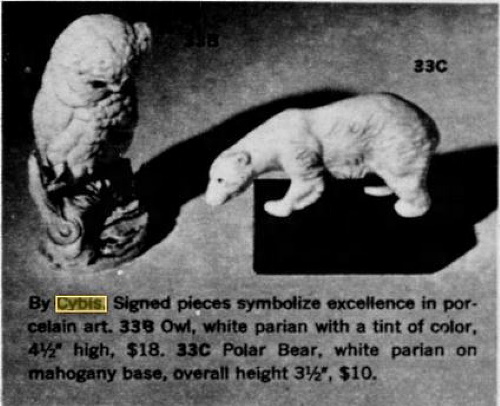 The very first bisque (non-glazed) bear was mentioned in Cybis in Retrospect, although not pictured, but I recently found this early-1960s newspaper clipping showing the Polar Bear. According to Retrospect, it was made only from 1961-1963 and was about 4″ wide. The mold was later tweaked to produce a similar bear several years later.