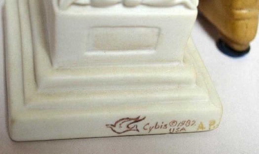 There are several interesting things about this bust. One is that unlike the normal in-mold copyright date, this one says “1989/90” which is not a valid format for a copyright year; copyrights are registered on actual specific dates, not year ranges. This bust isn’t in either of the two 1989 Cybis brochures that I have, so it was probably a 1990 release. Another anomaly is that the sculpture number was not in its normal location adjacent to the signature and mold marks, but was instead put onto the underside of the piece. I have no idea if they are all numbered that way.