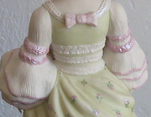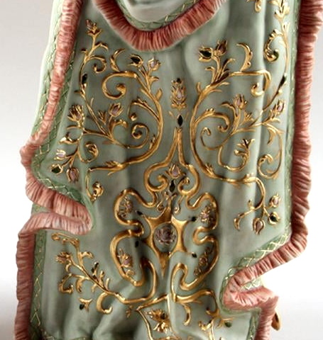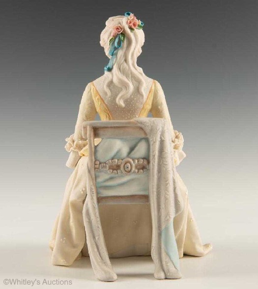 Some of these have a pair of small ‘firing holes’ at the top of her bustle in addition to the normal ones on the piece’s underside. Sculptures lacking these holes may instead have a gap elsewhere in the upper body section. Normally one only finds firing holes on the underside of a piece and so the presence of these extra “outlets” may have been necessary in order to avoid losses in the kiln. One would think that these holes, if needed during the bisque firing, would have been patched before painting; perhaps some were but others were missed? Or perhaps the problem occurred during the paint firings.