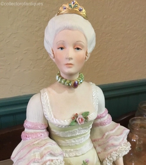 Good Queen Anne (1665-1714) was the daughter of James II of England and queen in her own right from 1702-1714. Cybis’s Anne is 14” high; she was a declared edition of 750 in 1978 for $975, but the edition size was reduced to 550 in 1980, and then to 350 in 1981. However, quite a few sculptures that are numbered in the 400s exist; this Archive post discusses the possible reasons. A different English queen, Anne of Bohemia – wife to Richard II during the 1200s – was also popularly known as “good queen Anne”’ because she would often intercede with the king on behalf of the welfare of the peasantry.