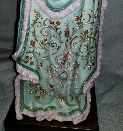 There are two very slightly different versions of Eleanor: in some examples she wears only one ring (the large ornate one on her left hand) and in the other version – shown above – she wears two rings (an additional wide plain ring on her right.) The official Cybis photo seen in their 1979 catalog shows the two-ring version. The difference doesn’t seem connected to the sculpture numbers, because a casual survey of sold Eleanors doesn’t show any pattern. For example, numbers 231, 252 and 391 all have one ring while numbers 199, 200 and 249 were made with two rings. Was the righthand ring an actual item that was added to that finger, or was it part of the mold for some castings but not others? And why? It has also been noticed that on some Eleanors the gilt edge of her robe has an embossed pattern but on others that surface is plain.