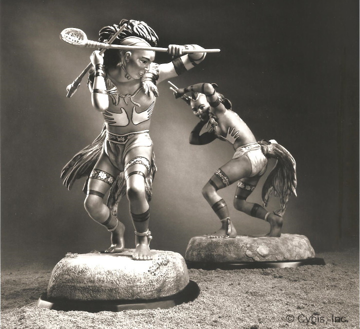 Choctaw, Tascalusa lacrosse player, 1982; 16” on base, sculpture is 14.5” h. An issue of 200, it sold for $3500 in 1988. (This was a single sculpture; the second image is a press photo by Cybis, staged to show two together as if playing the game.) This was the final Helen Granger Young design that the Cybis studio introduced.