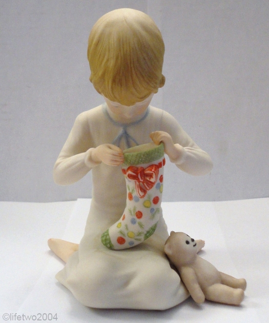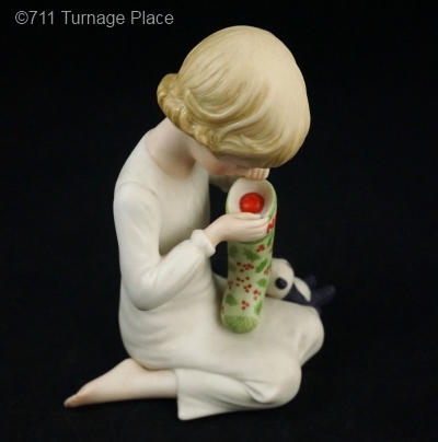 The first was the 1980 Holiday Child who is looking down into a green Christmas stocking decorated with holly and berries and the word “Noel” across the top. A panda bear leans against the child’s left leg. This piece was priced at $235 at introduction. For the sake of clarity, because there ended up being so many variations of these children, I’m going to expand its title to 1980 Holiday Child with Green Noel Stocking and Panda Bear. This sculpture was available for purchase only during 1980.