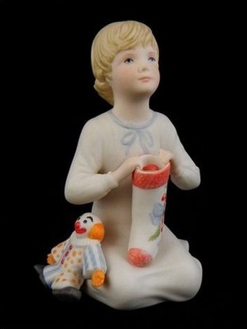 - 1993 Holiday Boy (looking down, with unknown-background Noel Stocking and Clown Doll; blue collar tie)