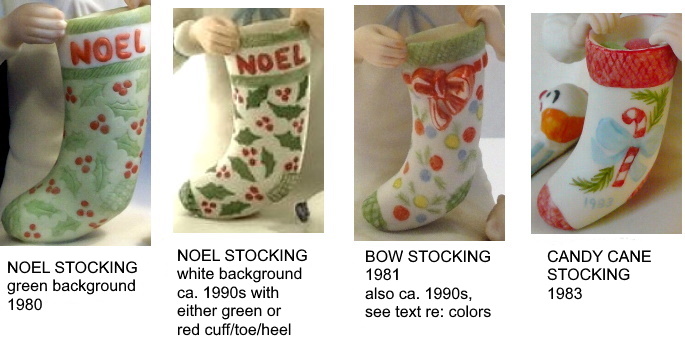 These are the known Holiday Child stocking versions. The caveat about the ca-1990s Bow Stocking is that I don’t know if the colors were identical to the 1981 version. It’s possible that they may have changed up the bow and/or the cuff/heel/toe colors, or perhaps painted the decorations differently. The one thing that would not change is that the bow itself is part of the mold.
