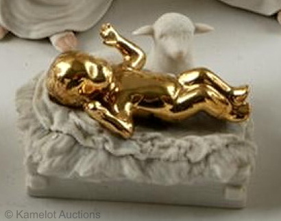 The Christ Child with Lamb rounded out the set’s introductory year, and is 2.5” high. The first pricings were $215 for white and $275 for color (upper photo). The lower photo shows the gold-accented version which was $250. Like the original 1950s Holy Family, the baby is removable to accommodate the tradition in some Catholic families of not placing the child into the manger until Christmas Eve.