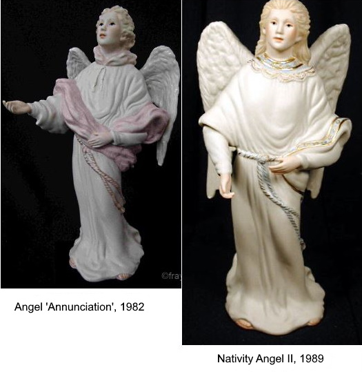 The first addition to the set appeared in 1989 as Nativity Angel II priced at $475 in white, $525 in Anniversary (lowest photo), and $575 in color. However, this piece is simply a mold modification of the Angel ‘Annunciation’ that had been introduced in Fall 1982 and retired sometime between 1984 and 1988. The white bisque example in the first photo has the 50th Anniversary mark on the underside.