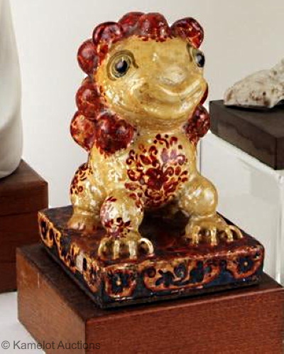 The earliest Cybis canine I have discovered is this charming little Foo Dog from the 1940s. The auction house that sold it did not provide a photo of the signature but I would not be surprised if this was made by Marja Cybis; the sculpt and paint style are very similar to other pieces she did at that time which are signed MC to indicate that she created it. This is a small piece, only a few inches high and might not be attached to the 2″ high wood base beneath it.