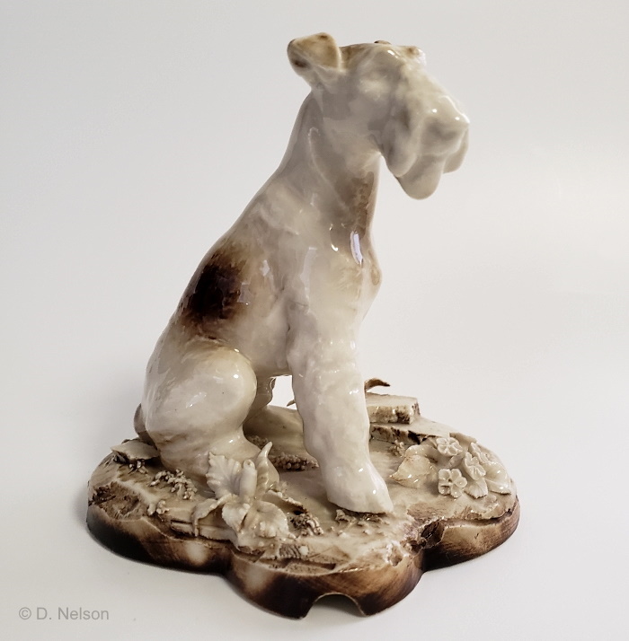 There is an open-edition Scottie listed on the text-only page of “verified Cybis sculptures” in their 1974 catalog; this piece would have been sold by the studio during the 1950s. Assuming that the list’s name is correct, this piece – although a Scottish Terrier – would not have looked like the Fox Terrier shown above. The ears of a ‘Scottie’ are upright, their legs are much shorter in proportion to the body, and their coats are always a solid color.