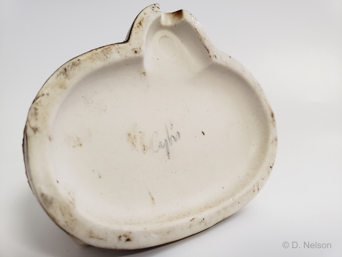 The base section is odd because it has a cutout that would normally only be required if the mold was going to be used as a lamp base. Not only is this dog not a lamp, but the opening is in the front rather than the back, as would be normal even for a lamp. A couple of scenarios could account for this. Perhaps the base came from the Philadelphia shop, where Cordey items and lamps were being made, and someone in the Cybis shop forgot to re-cast the mold after closing up the opening. Or the base could have originally come to the Cybis shop along with any of the Holland or Atlantic molds they regularly purchased, and again the opening was not closed up as it should have been. During the 1950s Cybis did sometimes use the base mold from the Holland kits they bought. For example, Holland sold their mallard duck lamp mold set along with a lamp-cord-cutout base, but when Cybis produced their Mallard Ducks and Teal Ducks from those molds, the opening was eliminated. What is strange is that nobody seems to have caught this omission, even while they were painting and glazing the piece! You would think that somebody would have said “Hey…ummm…why is this weird opening here?” But apparently nobody did. Very strange!