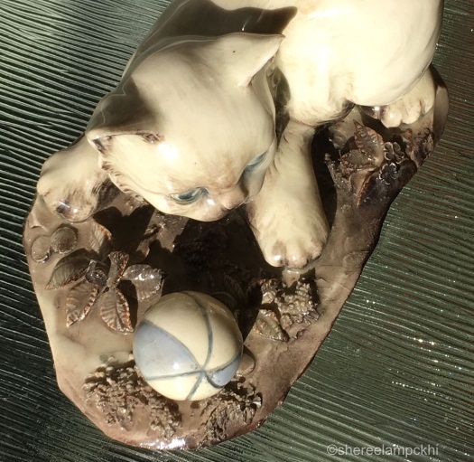 Only one Cybis sculpture ever included a cat as a secondary element: Suzanne, an nonlimited edition issued in 1980 which is shown here along with the other “children” pieces. The cat is 1.5” high and 3” long.