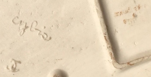 This particular kitten shows a couple of unusual markings on the underside. The faint reddish brown stamp says “Cybis Fine China”; a more typical paint color for this was blue, but black and this reddish color were also used. The Cybis signature is the less common convex (raised) type, and the piece also has the double-C mark as well. Signatures and Marks shows all of the known Cybis marks and their dating.