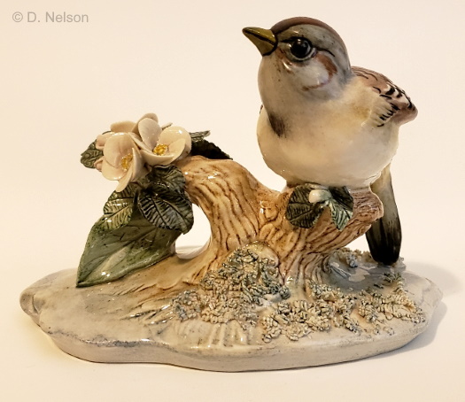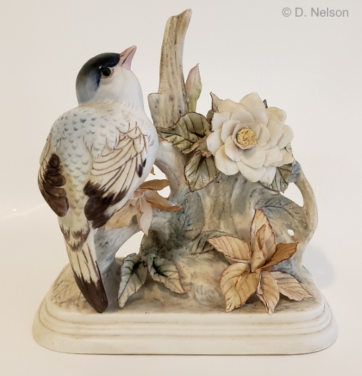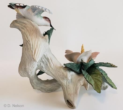 In the Western Tanagers we have two different Holland Mold Company birds combined: the closed-wing one shown above, and the open-wing one that is seen on a couple of early-1960s pieces. This suggests a late-1950s timeframe for this particular design. A surprising discovery was that this specific one was once attached to a wood base. This would never have been known except for the fact that the ‘wings’ of a toggle bolt was discovered to still be inside the sculpture! This begs the question of whether this piece was mounted similarly to the Golden Mallards which was also a two-birds piece. This design uses the same porcelain base as in the Tree Sparrow, but with a second bird on the longer branch section instead of a group of flowers and foliage.