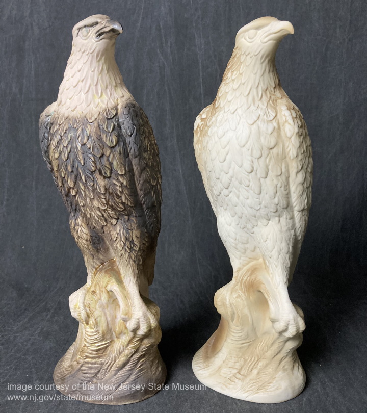 Both of these are in the collection of the New Jersey State Museum, which I thank for providing this and other photos. The eagle on the left is darker than one would expect of a Cypia piece. The bird on the right has only had the very first color applied, so is obviously unfinished. Ironically, the actual American Bald Eagle, Haliaeetus leucocephalus, has much less white on its body than seen on any of the Cybis representations!