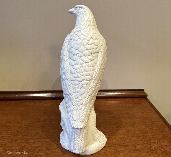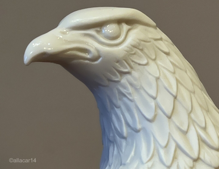 These photos of a white bisque example show that the retail pieces did receive a subtle layer of clear glaze on the eyes and beak.