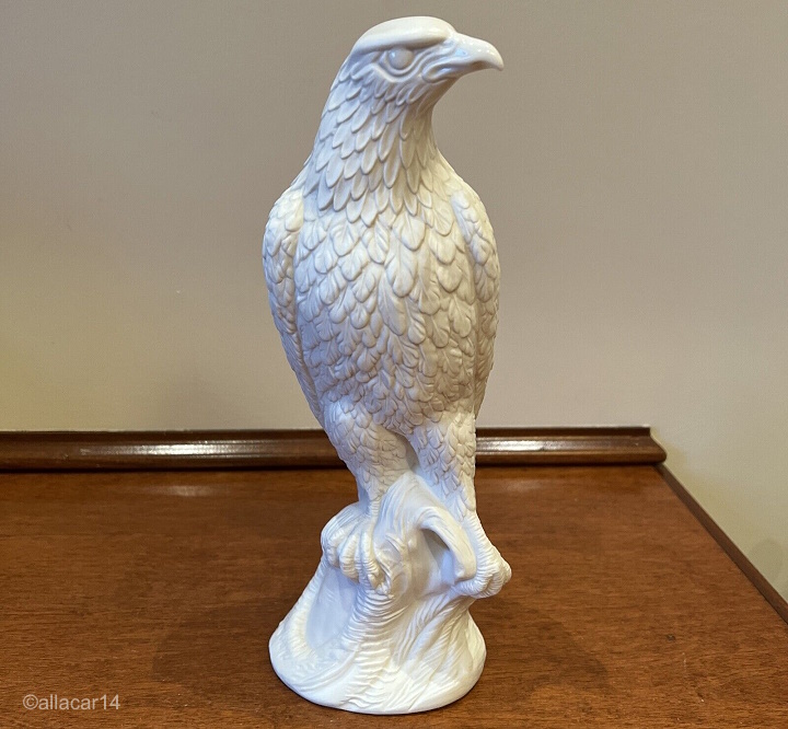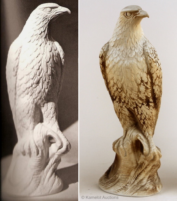 The American Eagle is 14” high and was sold as a pair, available in white bisque and in color. The white was made 1954-1960 and sold for $60; the color, from 1955-1960 for $90. This is the only known Cybis bird that was sold as a pair of two identical sculptures; all of the other bird pairs are two different designs. The right-hand photo above shows a bird in their Cypia tonation, which was probably included in the studio’s definition of a “color” piece. The design number for this mold/pair was #302.