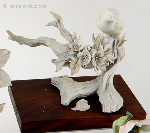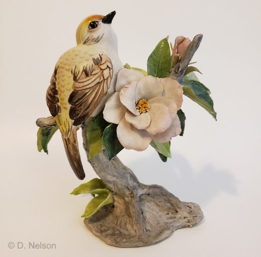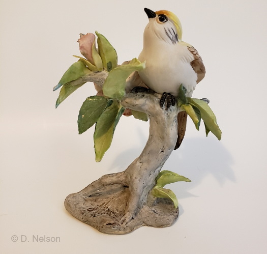 It too was made in color and in white bisque. Examples of the white one have been found with a base in either the light (above) or dark brown wood. The Cerulean Warbler was assigned design #338 but some of the white bisque pieces may still retain a penciled design number of 338W. The white version sold for $70, and the color for $90, throughout their production runs.