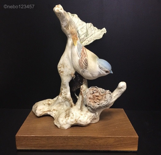 The Blue (Headed?) Vireo ‘Building Nest’ was an open edition produced 1960-1965 (although Cybis in Retrospect says it was retired in 1963.) It is 8.5″ high and was offered in color for $75 and in white bisque for $60. Some Cybis literature lists this as “Blue Headed Vireo..” while others say “Blue Vireo.”
