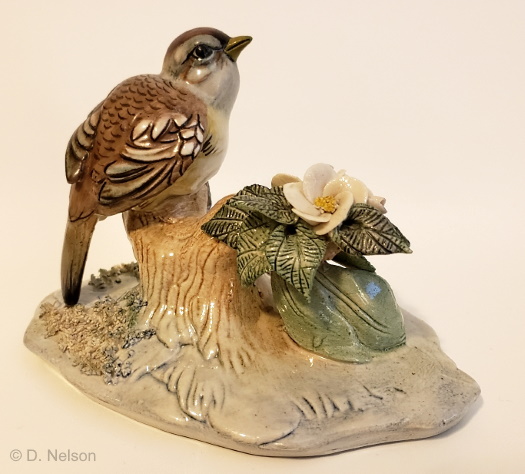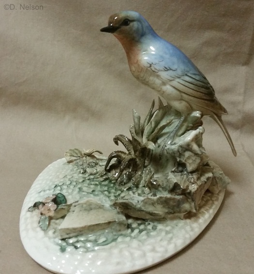 Bluebird ‘By the Garden Wall’, 6” high, was made from 1952-1962 in color as shown for $37.50; a plain white bisque version sold for $30. Notice the “chunks of rocks” which were also used in the waterside duck sculpture. The bird’s body mold appears to be the same one used for the 1960 Cerulean Warbler shown in in the next section. This retail release was given design #329.