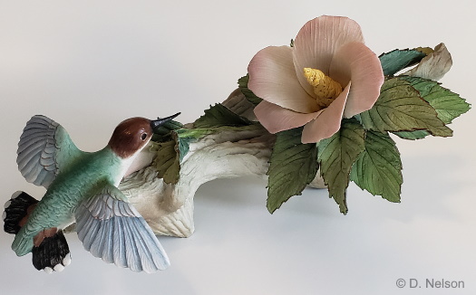 Just squeaking into the 1950s introductions by a hair (or feather?) is the Hummingbird which was produced from 1959 to 1963. It is 9.5″ high and was made in the color version shown here and also in plain white bisque. This is the first photo I have seen of this piece and I admit I was very curious to whether they managed to portray this bird (as Boehm and Connoisseur of Malvern did) in a delicately hovering position….and indeed, as we see, they did not attempt to. During its’ five years of production the white version was priced at $75 and the color one at $95.