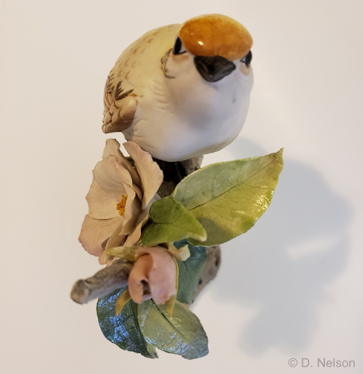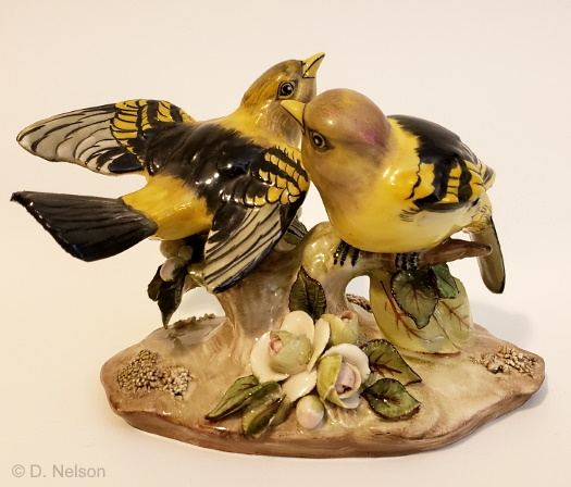 The Golden Crowned Kinglets were a pair made from 1960 to 1962 (or 1963); they supposedly sold in white for $65 and in color for $85. I have only seen this photo of one of them so far. Cybis literature gives a 10″ height but this one is 8.5″ and so perhaps the other piece is taller. (This is not the same sculpture as the 1978 Kinglets on Pyracantha pair, nor the much later single piece called Golden Crown Kinglets with Crab Apple from the 1990s.)