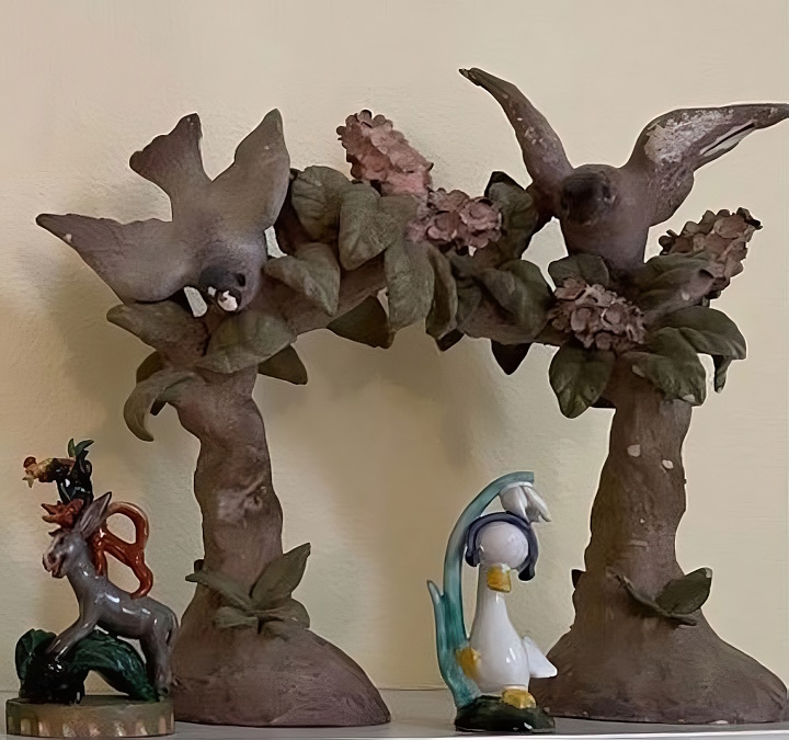 An intriguing mention in Retrospect is of an Abstract Bird, from 1942-1944, described as being 8” high in glazed porcelain and a “prototype for future release.” This one was not papka. A bird perched on a tree was a favored subject, such as Bird on Tree (“pastel tones with pink blossoms”, 12.5” h) and the possibly similar Bird on Blossom Tree (“soft pink and blue”, 11” h.)