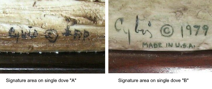 Recently, I came upon an old eBay listing for a pair of single (made as separate sculptures) Turtle Doves. I suddenly realized something that had not occurred to me about the single retail piece. I will call these individual pieces Single Turtle Dove A and Single Turtle Dove B.